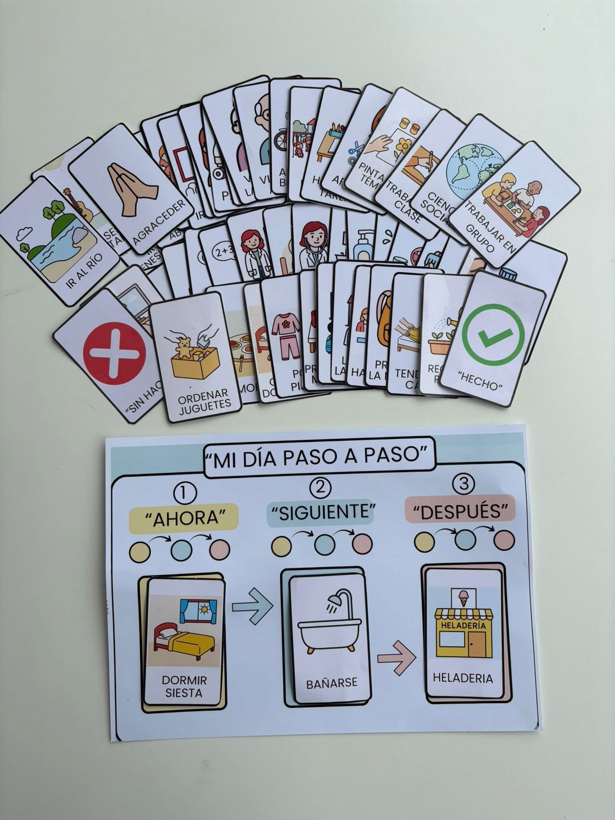 ✔ Panel visual “AHORA – SIGUIENTE – DESPUÉS” para organizar el paso a paso del día.