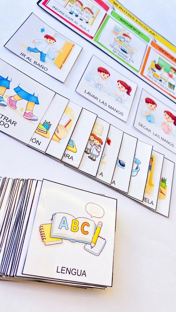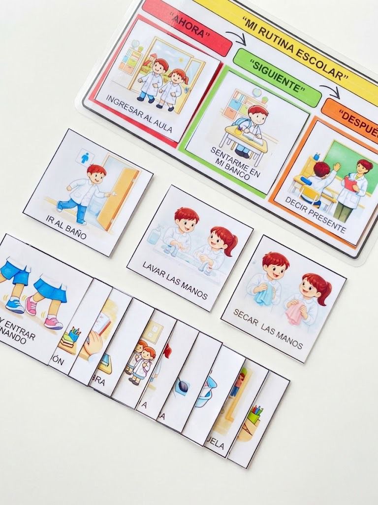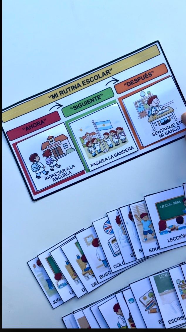Además, el kit incluye un panel visual de secuencia “Ahora – Siguiente – Después”, ideal para organizar las actividades del día y ayudar a los niños a anticipar qué están haciendo, qué actividad sigue y cuál será después.
